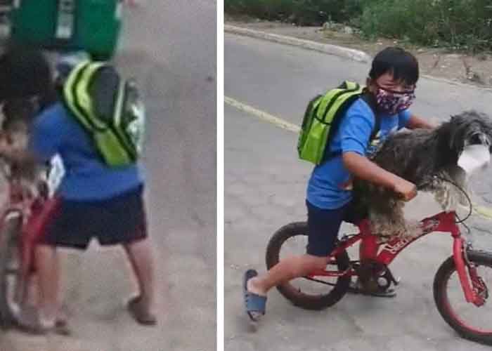 Anthony Hernández, originario de Ambato, en Ecuador, cautivó las redes sociales luego de que su madre lo enviara a la tienda para realizar unas compras. El pequeño se hizo acompañar de su cachorro, a quien le dio espacio en su bicicleta y le colocó un cubrebocas para cuidarlo de cualquier contagio. Aunque no se ha demostrado que las mascotas puedan contraer el virus, Anthony prefiere mantener a salvo a su fiel compañero.