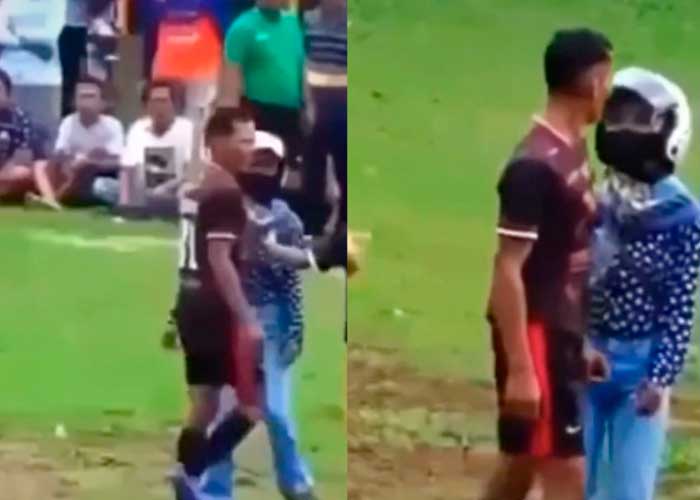 Usando el casco de motocicleta (que no se tomó la molestia de quitar), la mujer en cuestión simplemente entró a la cancha y se dirigió hacia su pareja, quien al verla ahí no tuvo una reacción precisamente de felicidad. Pero la cosa obvio no terminó ahí.