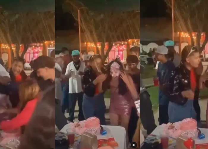 La grabación muestra a la joven cumpleañera rodeada de amigos, todos ansiosos por compartir el pastel de cumpleaños. Con la tarta frente a ella, se prepara para tomar un delicioso bocado mientras sostiene un cuchillo en su mano derecha con la punta hacia arriba. Mientras se dispone a cortar el pastel, varios invitados deciden darle un toque de diversión al momento, intentando empujar gentilmente su rostro hacia la tarta en un gesto juguetón.