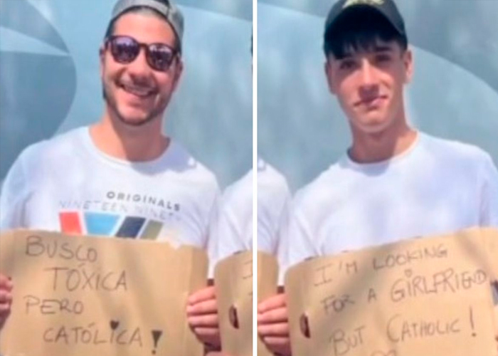 «Busco tóxica, pero que sea católica»; decía el rótulo. Mientras que el segundo joven llevaba escrito lo mismo pero en inglés.