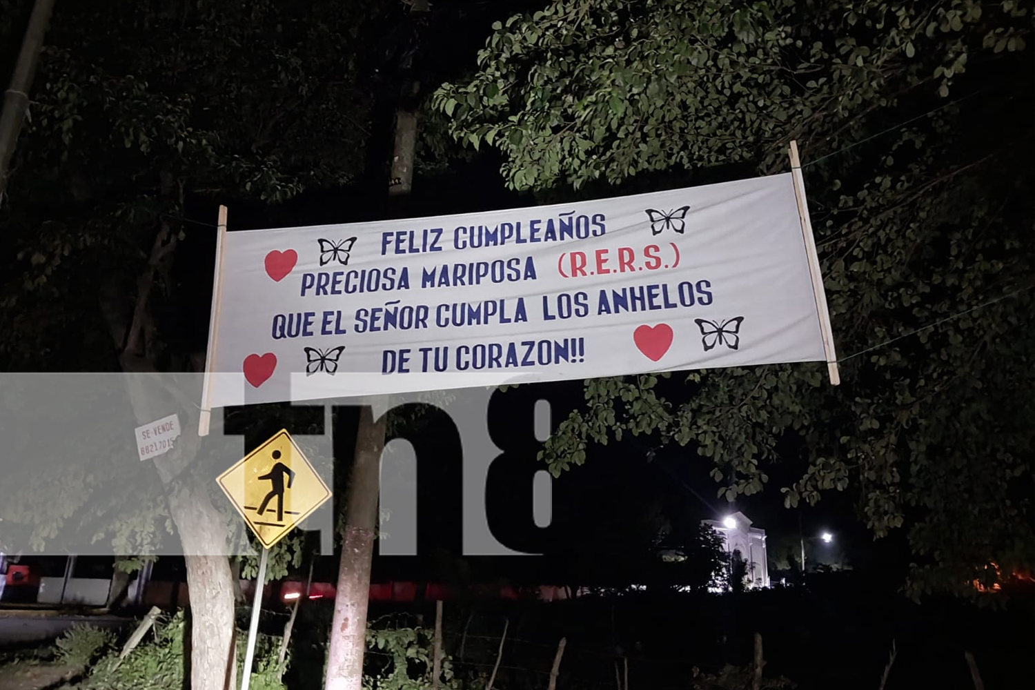 En San Marcos, Carazo, el amor o al menos un gesto lleno de sentimiento se robó las miradas de todos. A la entrada del reparto Álvaro Mercado apareció colgada una manta que decía en letras grandes y coloridas: “Feliz cumpleaños preciosa mariposa (R.E.R.S.) Que el Señor cumpla los anhelos de tu corazón!!”.