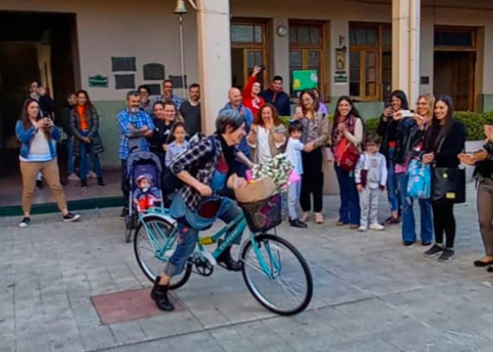 “Una bici nueva para que lleves tu sonrisa a todos lados”, expusieron. En el patio donde había apoderados alumnos y otros profesores, le entregaron la bicicleta con un ramo de flores en el canasto de adelante.