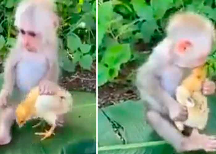 En la grabación se vio al bebé mono sentado en una hoja de plátano y jugando con el pollito al que sujetaba con una de sus manos. Además, se pudo ver al ave intentando escapar sin lograr su cometido. El primate pretendió calmarlo tirando de él y también besándolo para que se sienta mejor.