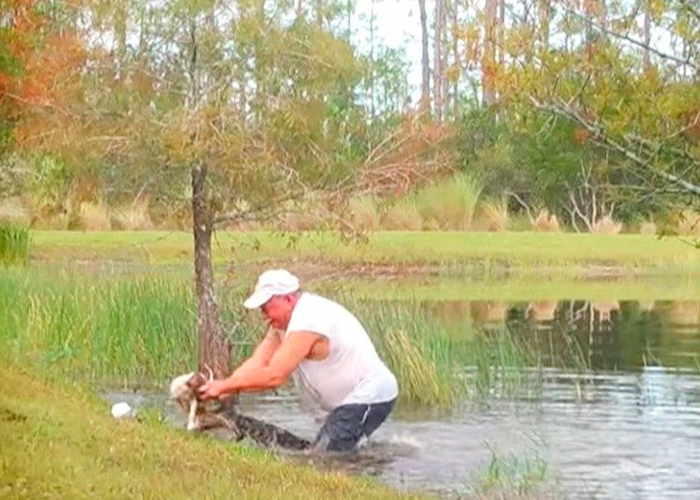 En él, se puede ver cómo un hombre valientemente se lanza al agua para salvar a su mascota de un lagarto que la había arrastrado al lago. Todo comenzó cuando, en un descuido, el hombre vio con horror cómo su querido compañero animal era llevado por el reptil hacia las profundidades del agua.