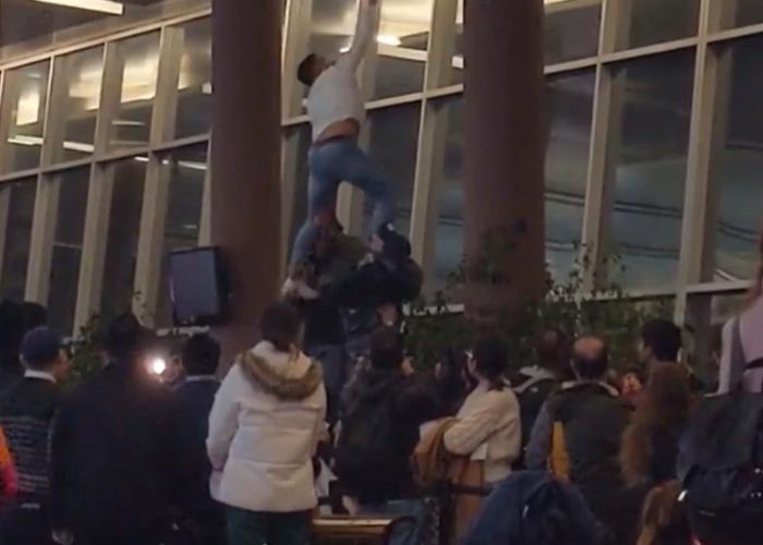 En el video, compartido por varios medios argentinos, se puede observar cómo el hombre que estaba en la punta de la pirámide y casi al llegar a cumplir el propósito casi se rinde, al no poder coger la cuerda que caía del globo; pero las personas que observaban lo animan con gritos para que siguiera intentando; vuelve a estirarse y lo alcanza.