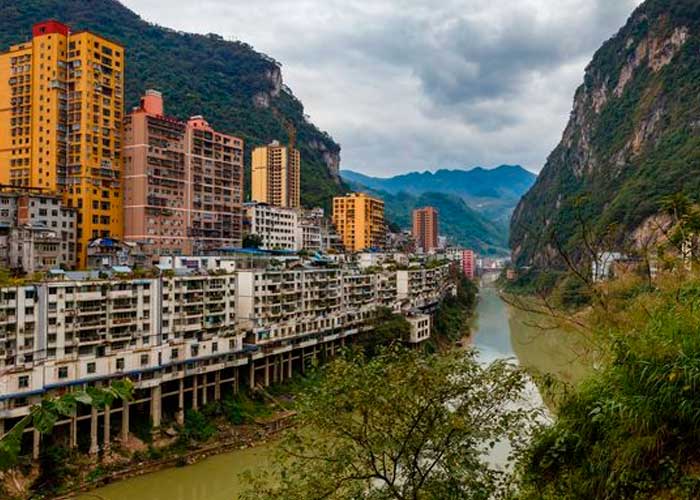 Pero más que por eso, por lo que Zhaotong llama tanto la atención es, probablemente, por la zona en concreto que mostramos más abajo. Vista desde el aire se trata de una urbanización de edificios alargados y altos que discurren a lo largo de un río angosto, rodeados de unas montañas empinadas. Como si, de pronto, hubieran surgido de la nada. Unos edificios que parecen mantenerse en pie casi por arte de magia.