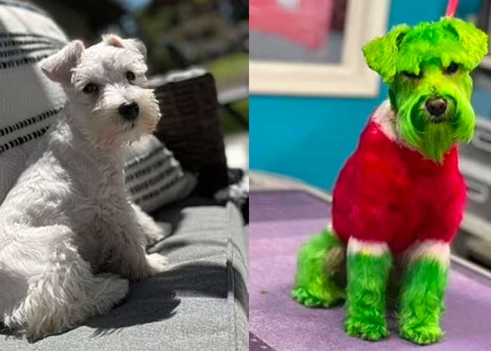 Tiñó a su perro de verde para “hacerlo parecido al Grinch”