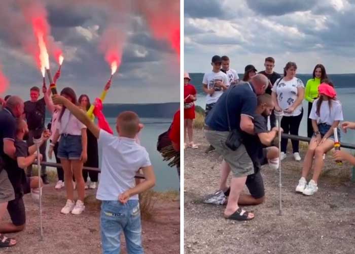A pesar de no tener una pierna, un joven se arrodilló frente a su novia para pedirle que se casara con él. En el emotivo momento participó el padre del joven, quien le ayudó a inclinarse.
