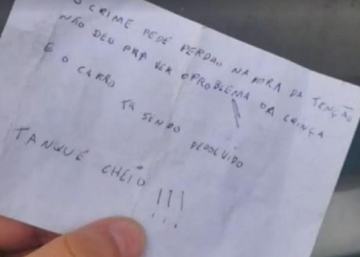 «El crimen pide perdón. En el momento de la tensión no pude ver el problema del niño. El auto está siendo devuelto. Tanque lleno!!!»; señalaba la carta.