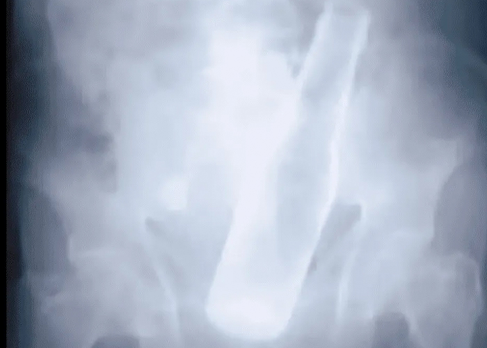 Un dolor intenso lo llevó al hospital, donde las imágenes de rayos X muestran el objeto alojado. Según los informes, el paciente se sometió a una «cirugía de emergencia»; pero no se dieron más detalles al respecto.