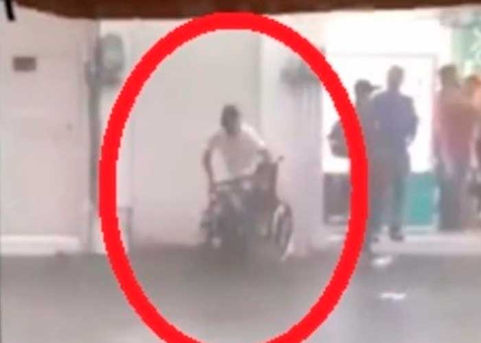 Al verse descubierto, el presunto discapacitado no pudo hacer más que llevarse las manos al rostro; una señal notoriamente de lamento, y quedarse sentado sobre la silla de ruedas en plena lluvia intensa.