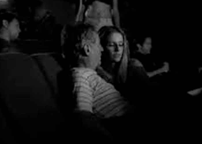 La mujer vio lo peor que pudo ver, se sentó en la butaca detrás de su esposo y lo confrontó. Mientras la amante, vestida de blanco, se va del lugar.