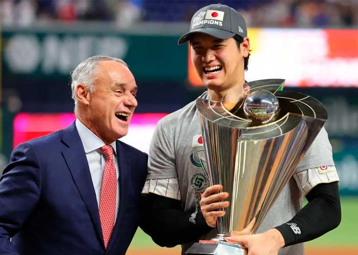 Junto a Rob Manfred y de Tony clark, Shohei Ohtani recibió el trofeo físico que lo acredita como el jugador más valioso MVP del Clásico Mundial de Béisbol, en el cual lució de principio con el conjunto de Japón.