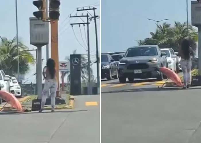 A un lado de la fémina estaba un paraguas y una bolsa, incluso se puede ver que ella corría peligro de ser atropellada, pero parecía no importarle nada más que vestirse; una vez que se terminó de poner el pantalón, procedió a colocarse una blusa.