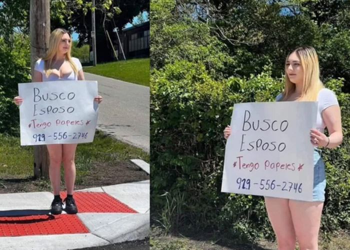 Una imagen se ha vuelto viral en las redes sociales debido a su inusual contenido: una joven sosteniendo una cartulina que dice: «Busco esposo Tengo papeles» junto con su número de teléfono.