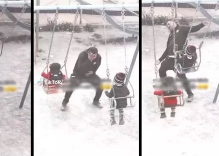 Mientras empujaba a su hijo varón en el columpio, el hombre fingía que el pequeño lo golpeaba cada vez que se acercaba.