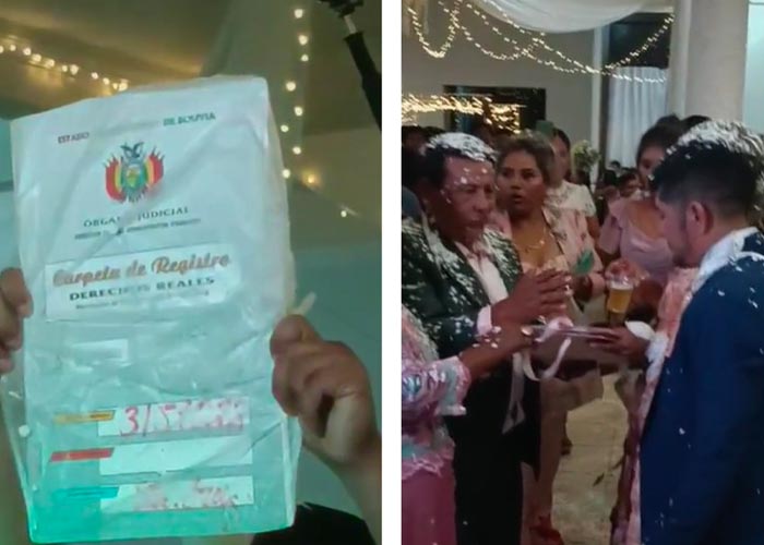 El usuario Bengi (@BengiPrisma), fotógrafo profesional que vive en Bolivia, compartió el clip del momento en que la pareja abrió un sobre con este gran obsequio. En la grabación, primero se ve a los que parecen ser los familiares de alguno de los novios abriendo un sobre amarillo y sacando el título de propiedad del terreno.