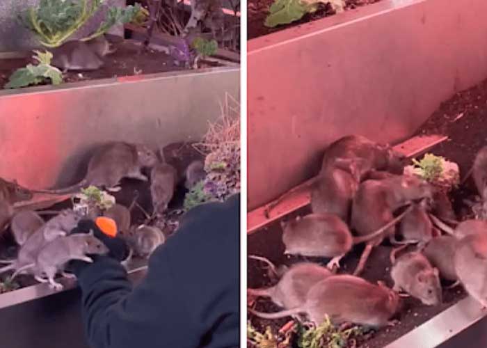 Pero lo que más captó la atención, además de la cantidad de roedores que se encontraba en la vista de todos, es que un hombre estaba alimentándolas como si fueran sus mascotas.