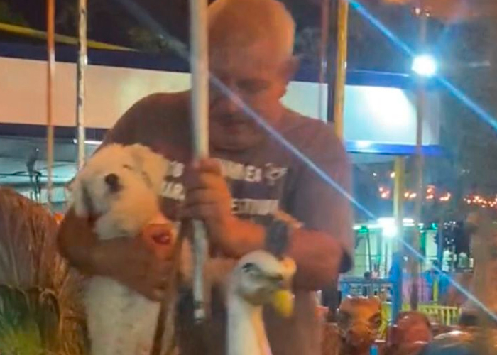 Posteriormente, aparece un señor de pie, mientras va sosteniendo a su perrito; quien se encuentra en uno de los animales, justo como si fuera un niño más.