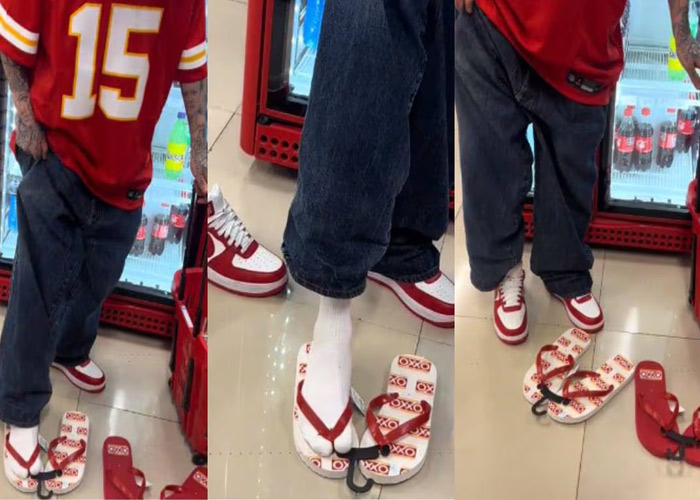 En el clip, Ángel Jair Quezada Jasso, también conocido como Santa Fe Klan, se quita uno de sus tenis Nike para probarse las sandalias del Oxxo, mientras comenta en tono bromista: “Algo bien, hija”.