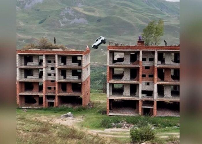 En uno de los clips se muestra el momento preciso en el que, desde una rampa, el vehículo comienza a descender con su Lada Niva de color blanco; sin embargo, no logró la velocidad necesaria para llegar al otro extremo y terminó cayéndose.