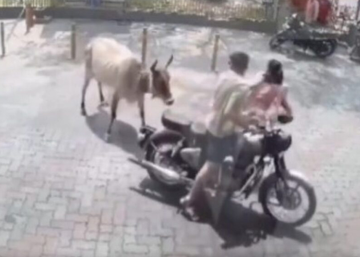 Una joven vivió momentos de horror en una calle de la India cuando una vaca la atacó inesperadamente mientras circulaba en motocicleta con su pareja.