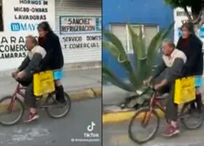 En el clip que se hizo viral en Twitter, se puede ver a una pareja de abuelitos que viajan juntos en bicicleta. Llevan una bolsa, por lo que probablemente fueron al mercado y es el esposo el que maneja la bici. Atrás de él está su pareja, que está subida en los diablitos y se sujeta de su pareja por la cintura.