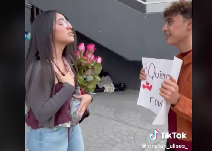 En el video se aprecia que el joven se acerca junto a la chica, muy apenado por lo que va a realizar, y en las manos lleva una cartulina.