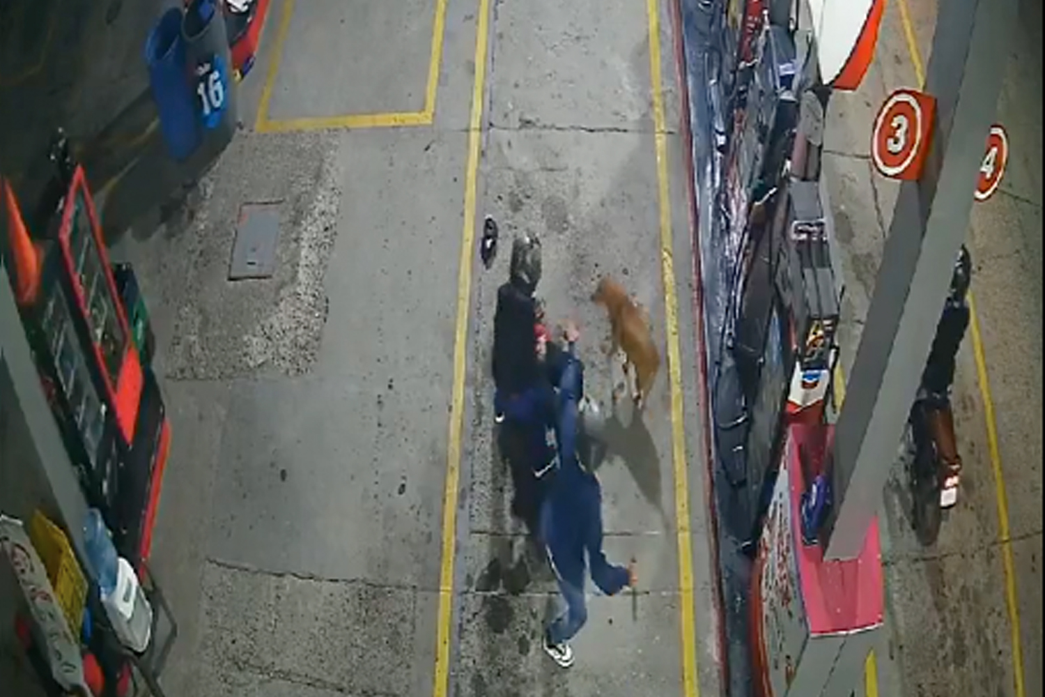 Fue en ese momento que un perro, que descansaba cerca de una bomba, vio la situación y salió a enfrentarse a los criminales, ahuyentándolos con ladridos y valentía. La escena fue capturada por cámaras de seguridad.
