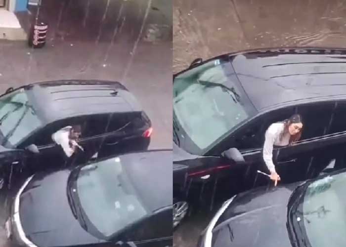 Durante una fuerte lluvia, un hombre estaba por irse de su lugar de trabajo en su vehículo, pero la camioneta de su exesposa le bloqueo el paso.