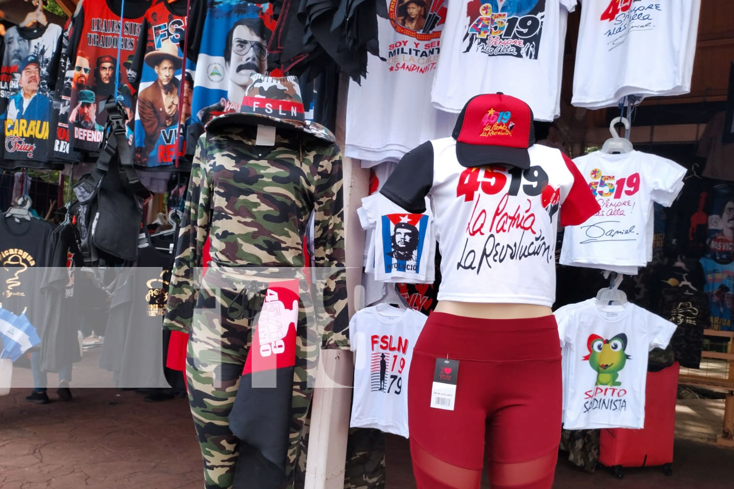 En la Avenida de Bolívar a Chávez hasta la Plaza La Fe, en el centro de Managua y principal destino de concentración de los simpatizantes sandinistas, se están vendiendo gorras; camisetas; sombreros; pañoletas; chaquetas; buzos; termos; y muchos artículos más.