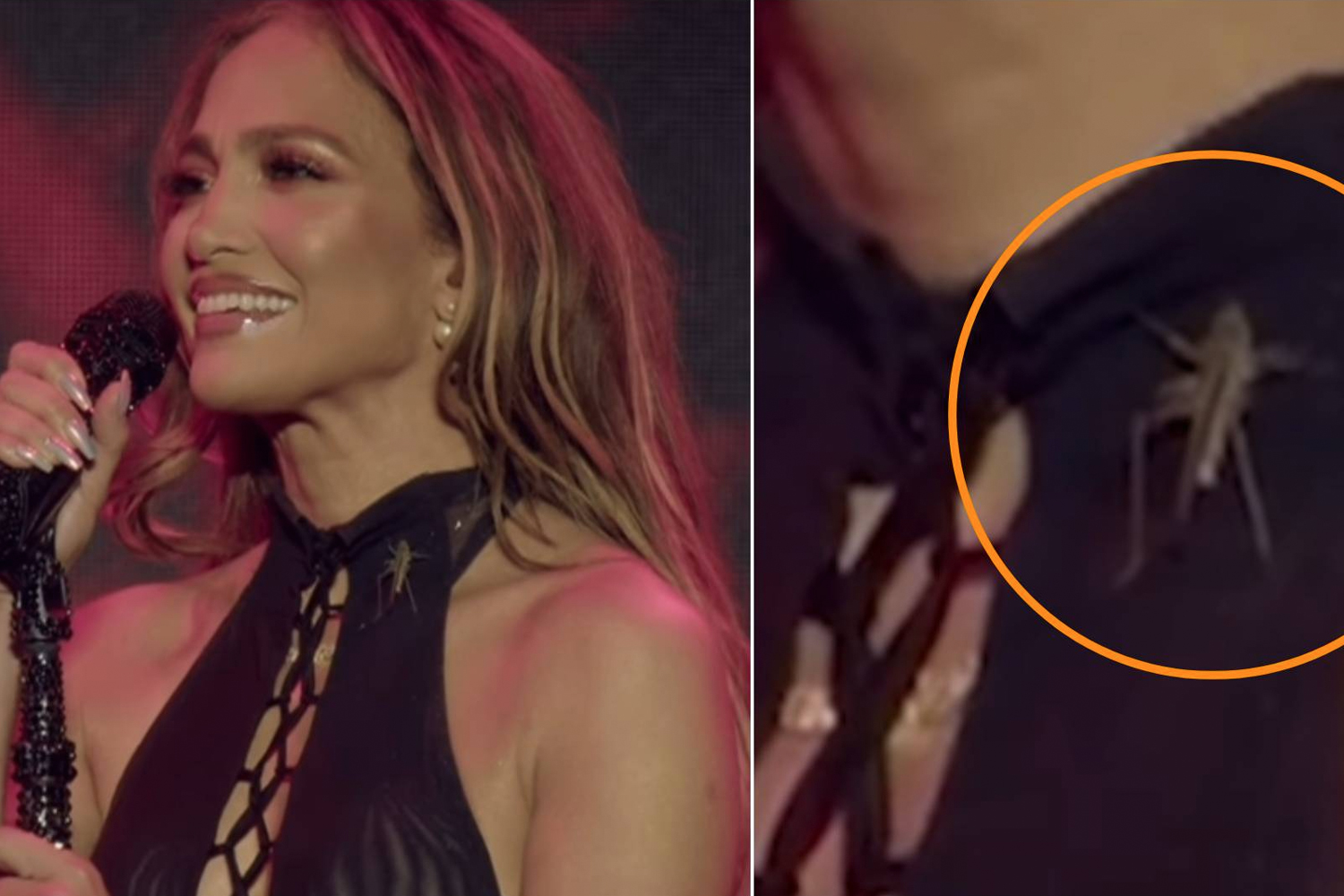 Mientras JLo cantaba frente a miles de personas, este curioso visitante trepó por su atuendo hasta llegar a su cuello. Lejos de perder la compostura, Jennifer atrapó al insecto con calma y lo lanzó fuera del escenario, sin detener su presentación ni perder la sonrisa. El momento fue captado en video y rápidamente se volvió viral en redes sociales.