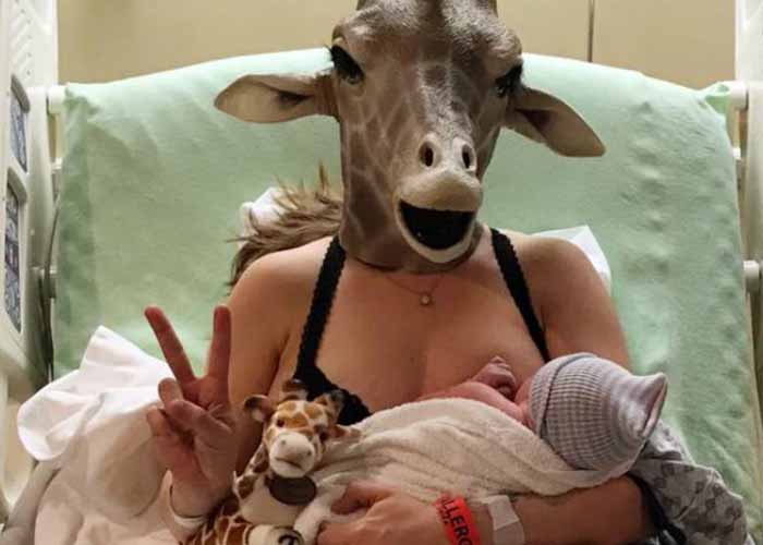 Pero Dietrich se anticipó el miércoles por la noche y dio a luz a un niño de unos 3,7 kilos llamado Porter. Llevó la máscara de jirafa al hospital y se la colocó para posar con su recién nacido.