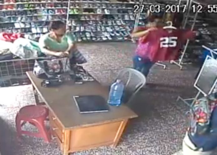 Estas dos mujeres se introducen como cualquier otras dos clientas interesadas en la variedad de artículos que tiene la tienda que por lo que se puede observar ofrece zapatos, ropa, entre otros. En un momento parece que están buscando ropa para varón porque visualizan dos piezas de color rojo pero inmediatamente aprovechan que la encargada de la tienda estaba atendiendo a otras personas y no perdieron el tiempo para utilizar sus artimañas.