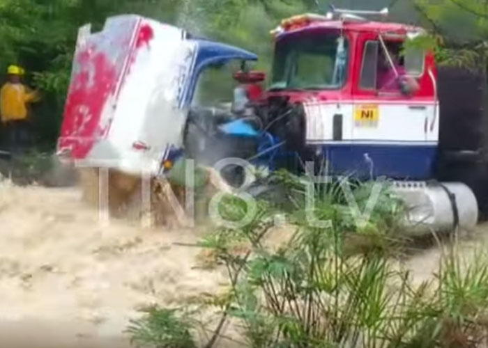 En primer instante se visualiza al conductor de un vehículo pesado, camión rastra, que aunque nota el peligro que se corre al pasar el río, se cruzó sin temer una desgracia que le pudiera ocurrir.