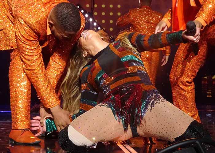 La cantante Jennifer Lopez tuvo que ser levantada por sus bailarines después de un mal paso de baile.