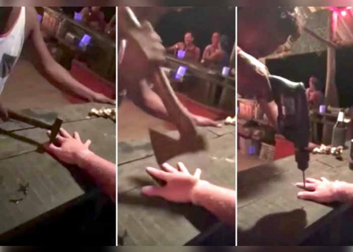 Enseguida coge un machete y vuelve a realizar la peligrosa rutina. Más tarde hace lo mismo con un hacha y finalmente pasa a utilizar el taladro.