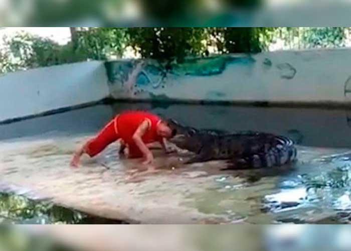 Un hipnotizador de animales metió su cabeza dentro de la boca de un Cocodrilo durante su show en un zoo tailandés y el animal la cerró con furia.