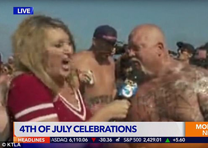 Algo así se pudo observar este martes cuando el medio de noticias KTLA estaba cubriendo a través de una transmisión en vivo este peculiar show, en donde hombres se disponen a ver quién aguanta más cantidad de cerveza al cruzar unos obstáculos, ustedes saben, con todo esa moral en alto y su famoso dicho "God Bless America".