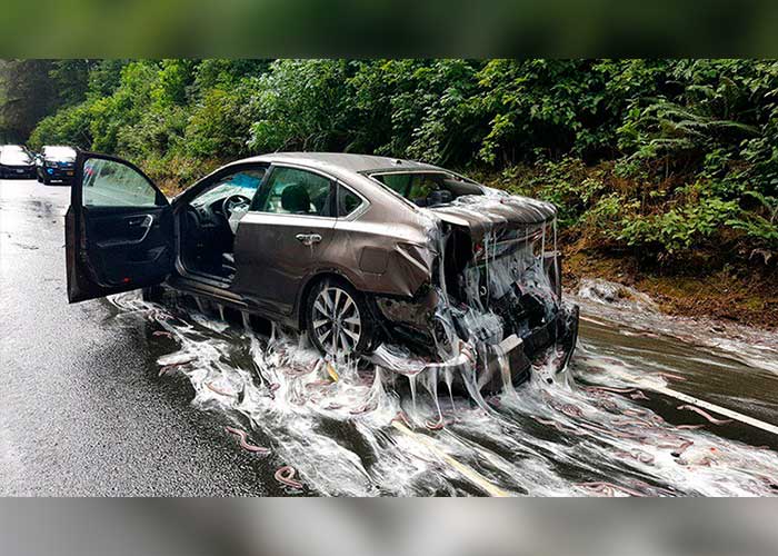 Un insólito accidente de tráfico ocurrido este jueves en Oregón, EE.UU., dejó toneladas de anguilas viscosas derramadas sobre la carretera y sobre los coches cercanos, informa el diario local 'The Oregonian'.