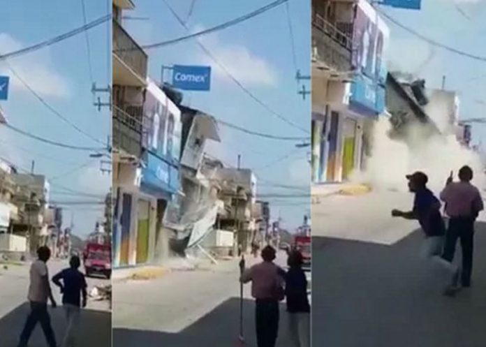 Una tienda de artículos ortopédicos en el municipio de Juchitán de Zaragoza, Oaxaca, se derrumbó ante los ojos de las personas que aún buscaban pertenencias y personas entre los escombros dejados por el terremoto de 8,2 grados en la escala de Richter que azotó a México el jueves 7 de septiembre.