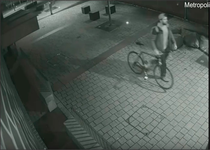 Ya pasada la media noche, otra imagen de circuito cerrado de televisión capta a la mujer que se tropieza en la calle Mint y es seguida por otro hombre con barba montado en una bicicleta de carreras. Posteriormente, las cámaras toman al hombre cuando se retira del lugar.