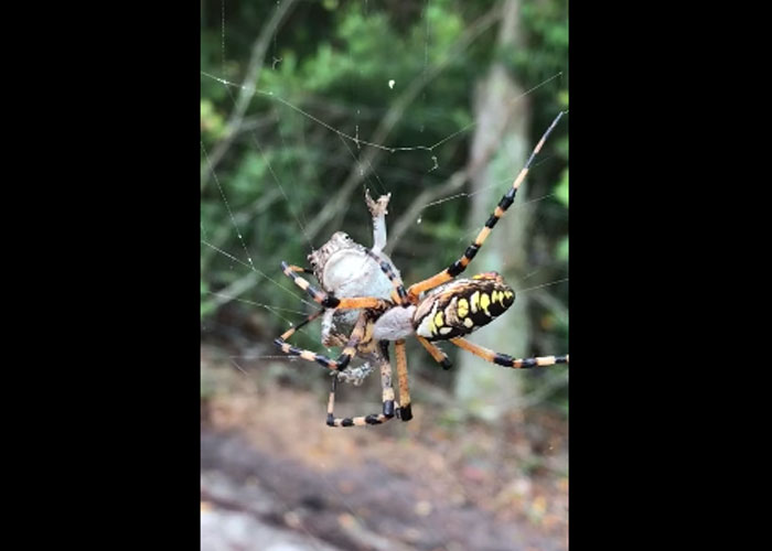En las imágenes, captadas el pasado 14 de octubre en la ciudad de Gainesville (Florida, EE.UU.), la araña bananera acecha al anfibio, paralizado e incapaz de huir, y con una serie de hábiles y veloces movimientos logra envolverlo completamente con su telaraña en tan solo unos segundos.