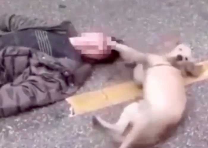 Varios transeúntes captaron en video el momento en que el cachorro se retuerce al lado de su amo e intenta desesperadamente que vuelva en sí, acariciando su rostro con sus patas delanteras y moviéndole la cabeza con el hocico.
