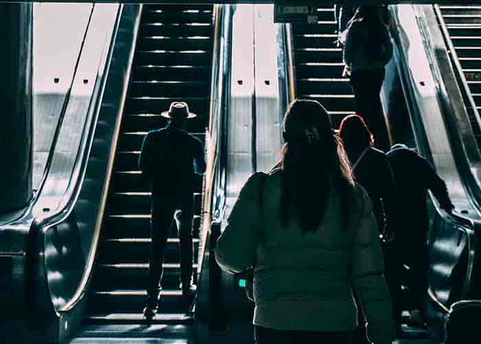 A continuación la mujer sube a la escalera eléctrica sosteniendo a la bebé en sus brazos acompañada de su marido.