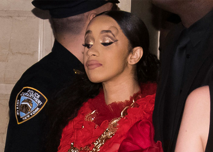Cardi B, vestida con un voluminoso vestido rojo de Dolce & Gabanna, fue vista saliendo de la fiesta con lo que parecía ser un golpe en la cabeza. Iba descalza.