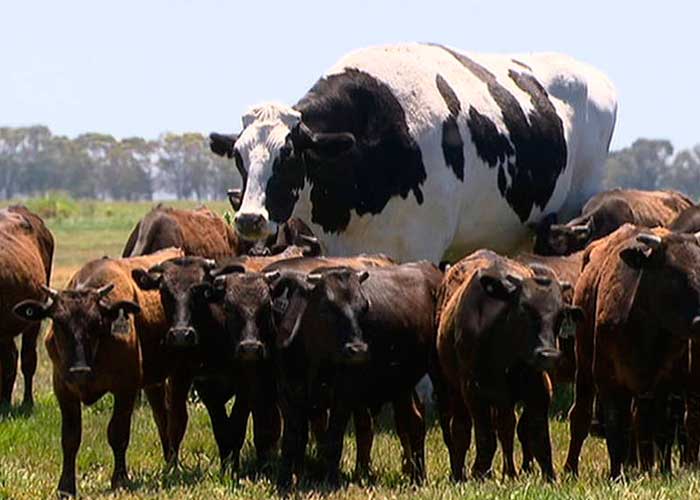 Este buey pertenece a la especie Holstein-Friesian y el ganadero que le ha visto crecer en una granja a 136 kilómetros de la localidad australiana de Perth, Geoff Pearson, no sabe exactamente qué ha podido pasar, pero confirma que es 3 veces más grande que el resto de sus compañeros bovinos. Para muestra estas imágenes que se han hecho virales en Internet y que confirman el tamaño.