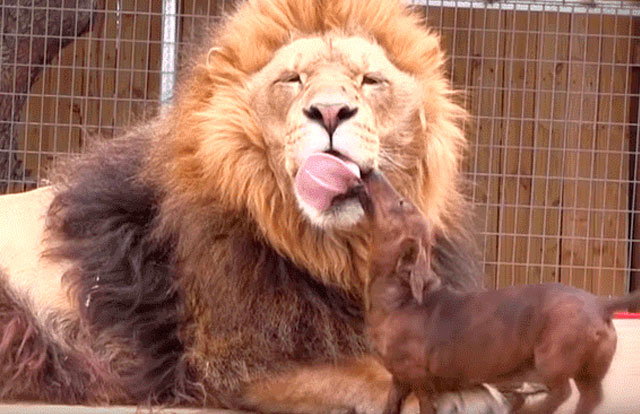 Es por ello que ‘Milo’ ha sido entrenado para facilitar los movimientos de la temible criatura peluda. El pequeño salchicha lame el hocico del león para limpiar su rostro y también como una muestra de amor, el pequeño animal no tiene temor de ser atacado porque ambos se conocieron desde bebés.