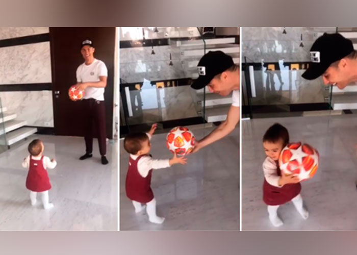 Cristiano Ronaldo aprovecha su tiempo, para jugar con su pequeña hija, dandole un poco de cariño y mostrandole el balon con el que ha tenido triunfo en su ultimo juego, ademas que su padre es un reconocido futbolista icono importante del deporte rey.