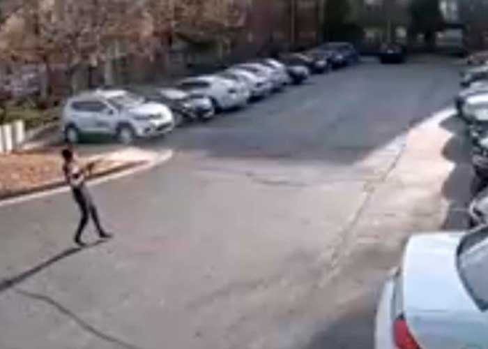 El vídeo, grabado por una cámara de vigilancia, muestra un SUV de color negro estacionado en la entrada de un edificio de apartamentos y a un hombre con un rifle, que sin motivo aparente comienza a disparar contra paredes y automóviles cercanos, huyendo a continuación.